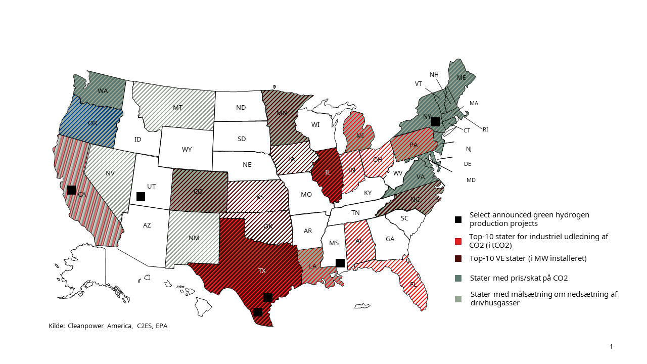 USA er lige nu verdens næststørste producent af brint. Her produceres omkring 10 millioner tons brint om året og amerikanerne overgås kun akkurat af Kina, der producerer ~25 millioner tons per år. I USA er al den producerede brint CO2-udledende og naturgasbaseret. Men den omfangsrige produktion understreger, at ekspertise og infrastruktur eksisterer i det amerikanske marked.