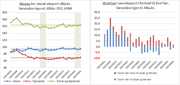 I løbende priser steg den samlede eksport af varer og tjenester 1,6 pct. i juni 2024 i forhold til maj i henhold til den seneste sæsonkorrigerede opgørelse fra Danmarks Statistik. Vareeksporten steg 1,8 pct. og tjenesteeksporten steg 1,5 pct. Årsstigningstakten, dvs. de seneste 12 måneder i forhold til 12 måneder forud, for hele eksporten steg til minus 3,5 pct. fra minus 4,3 pct. i maj især trukket af et mindre fald i tjenesteeksporten i juni i forhold til maj, jf. tabel 1.